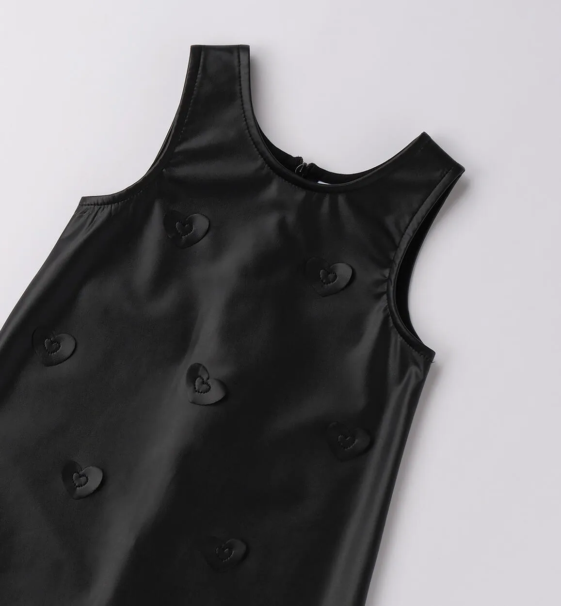 Abito smanicato bambina in tessuto spalmato nero lucido. Applicazioni a cuore e zip invisibile. Capo etico Animal Free.