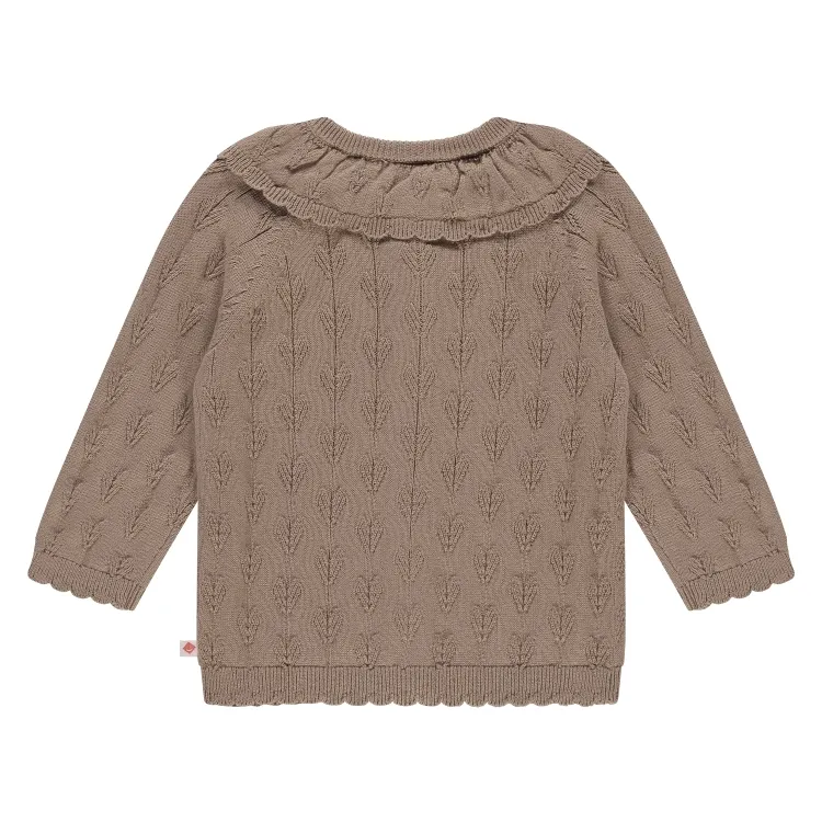 Cardigan bambina elegante in 100% cotone marrone. Bottoncini, colletto e motivo decorativo sulla trama.