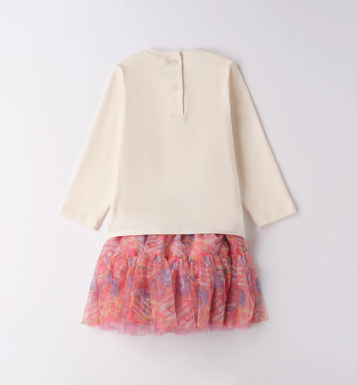 Un completo due pezzi che unisce la praticità alla fantasia. La maglietta in cotone morbido è arricchita da una stampa e luminosi strass, mentre la gonna in tulle con fodera in satin dona un volume divertente e giocoso. L'Arcobaleno seleziona questo capo perché unisce un design curato (lunghezza al ginocchio) alla sicurezza dei tessuti che garantiscono comfort e libertà di movimento.