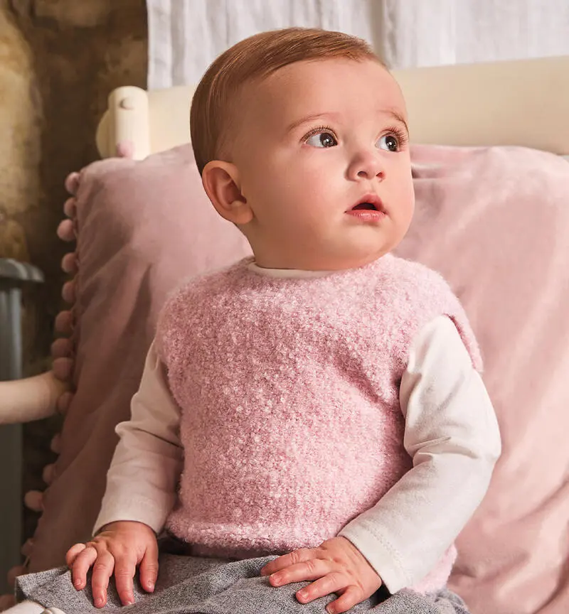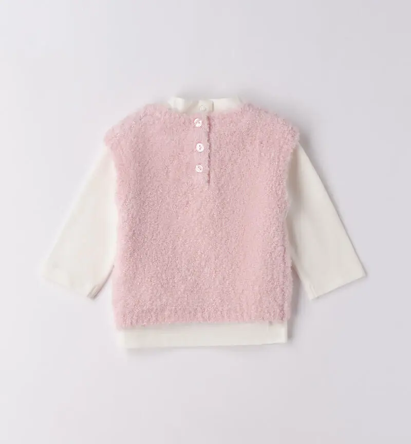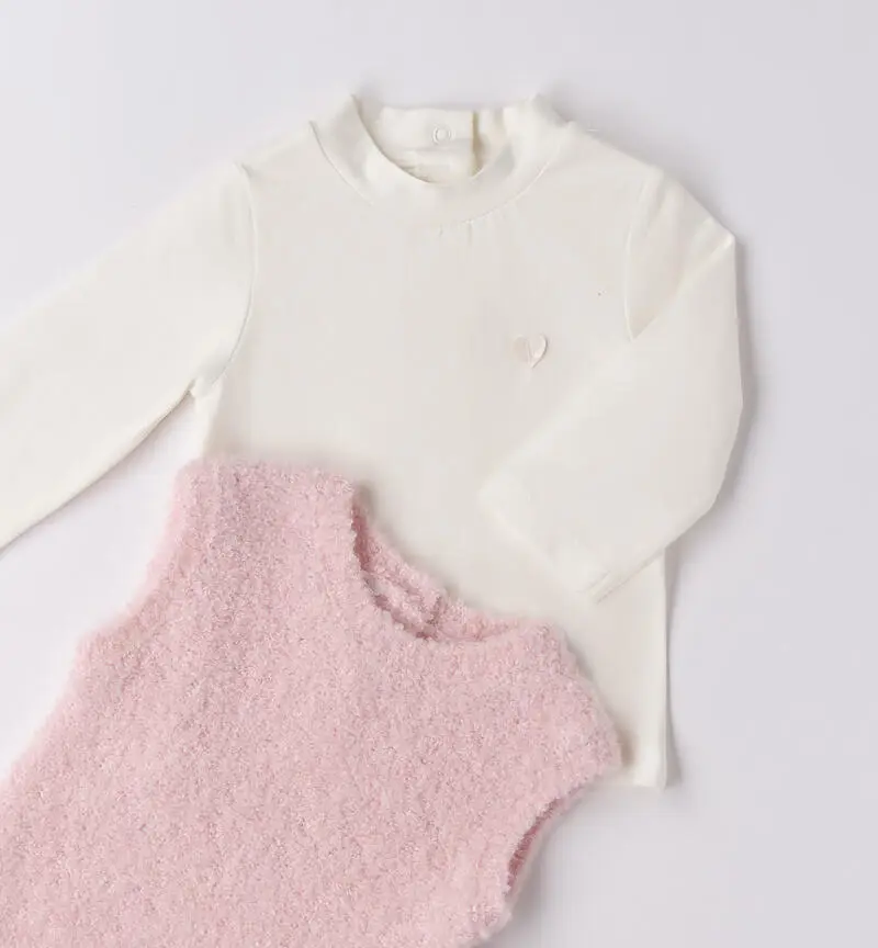 Delicato ed elegante completo Minibanda per neonata, perfetto per creare outfit raffinati e confortevoli. Il set è composto da una maglietta bianca a manica lunga, semplice e versatile, abbinata a un gilet rosa effetto teddy, morbido al tatto e ideale per aggiungere un tocco caldo e romantico al look.Pensato per garantire comfort, praticità e stile, questo completo è ideale per la mezza stagione e per occasioni speciali o l’uso quotidiano. I materiali di qualità assicurano una vestibilità comoda e delicata sulla pelle della bambina. Un outfit Minibanda che unisce dolcezza, eleganza e funzionalità.