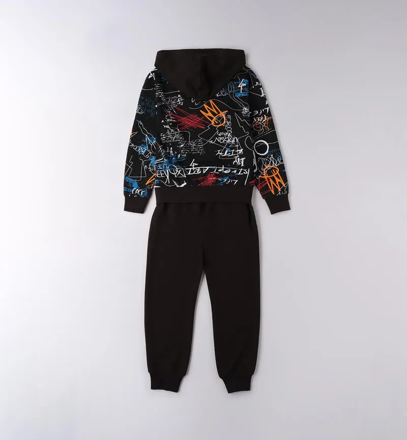 Completo tuta ragazzo dallo stile urban e moderno, composto da felpa con cappuccio. Stampa con graffiti multicolore e pantaloni neri coordinati. Realizzato in tessuto morbido e confortevole, offre libertà di movimento e una vestibilità pratica.