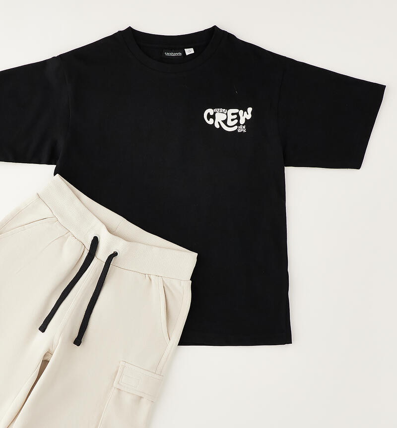 Completo ragazzo in 100% cotone con t‑shirt con scritta e shorts con vita elasticizzata e coulisse. Perfetto per look casual, confortevoli e di tendenza, ideale per il tempo libero e le giornate dinamiche.