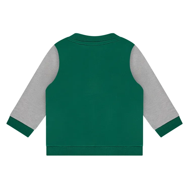 Felpa sportiva bambino stile college (verde/grigio). Chiusura cerniera e cotone BCI. Look dinamico e sostenibile.