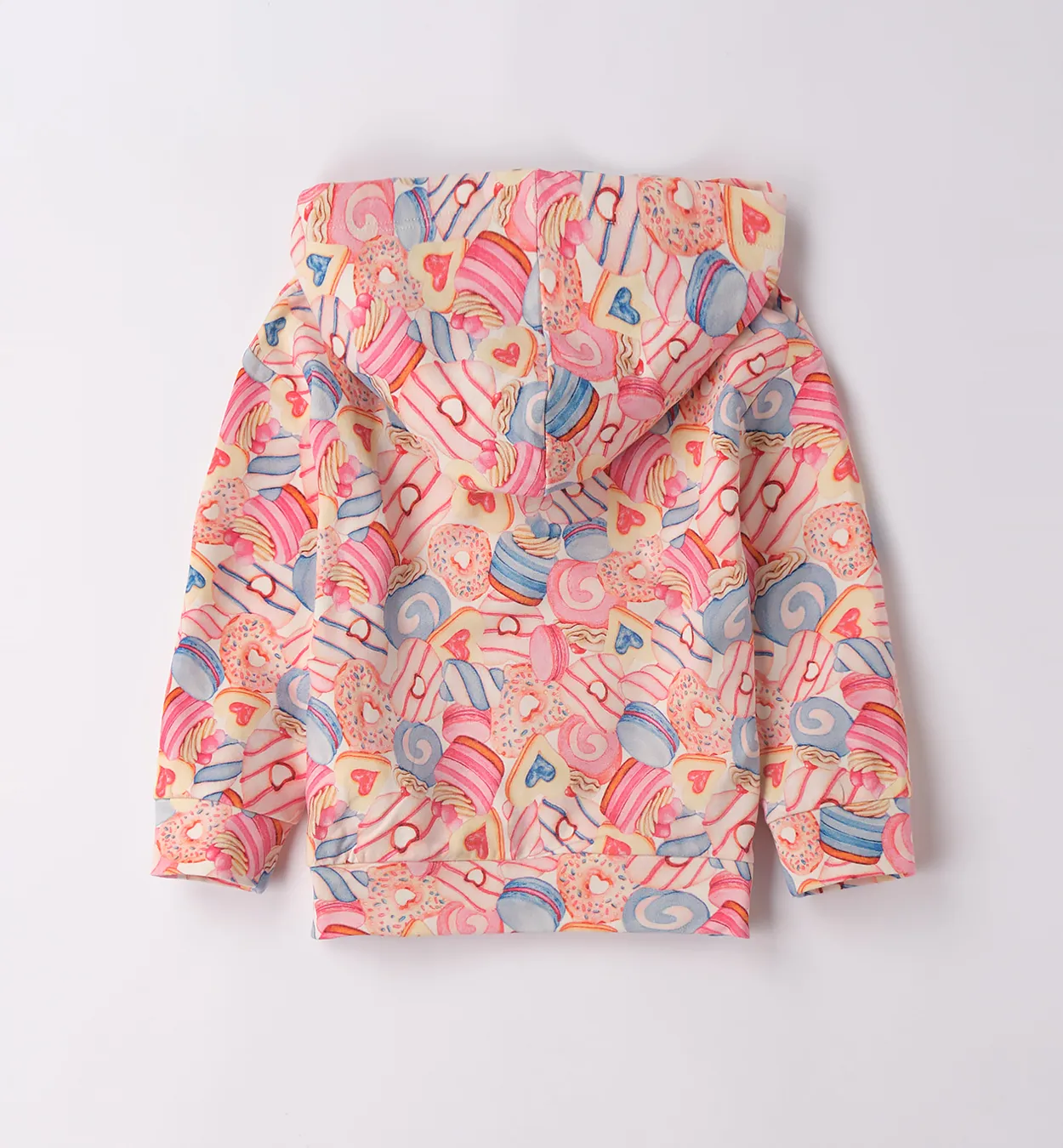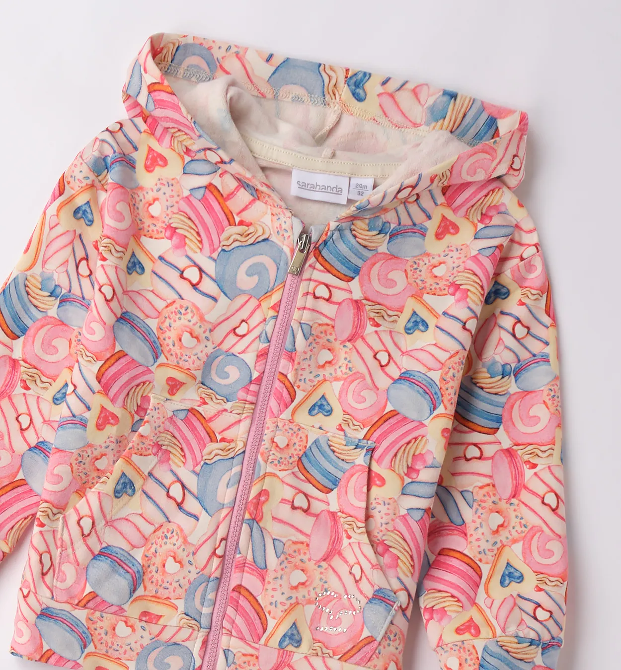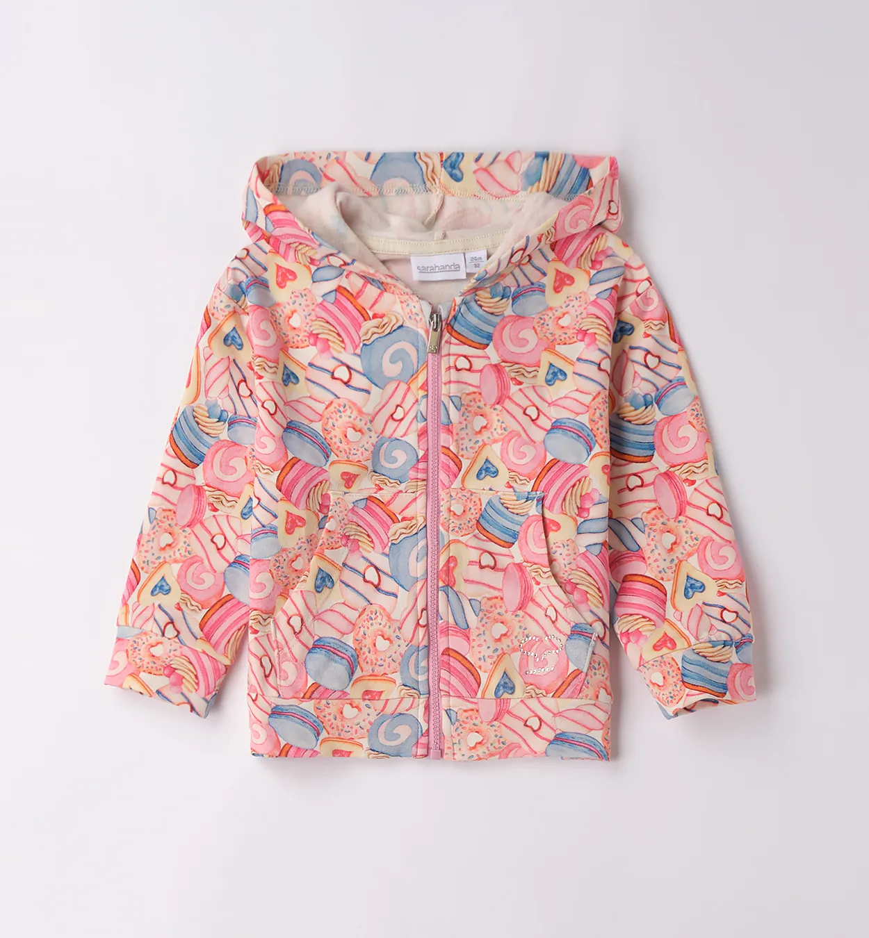 Felpa invernale Sarabanda con cappuccio, zip e felpatura interna. Morbida, calda e fantasia all-over. 95% Cotone.
