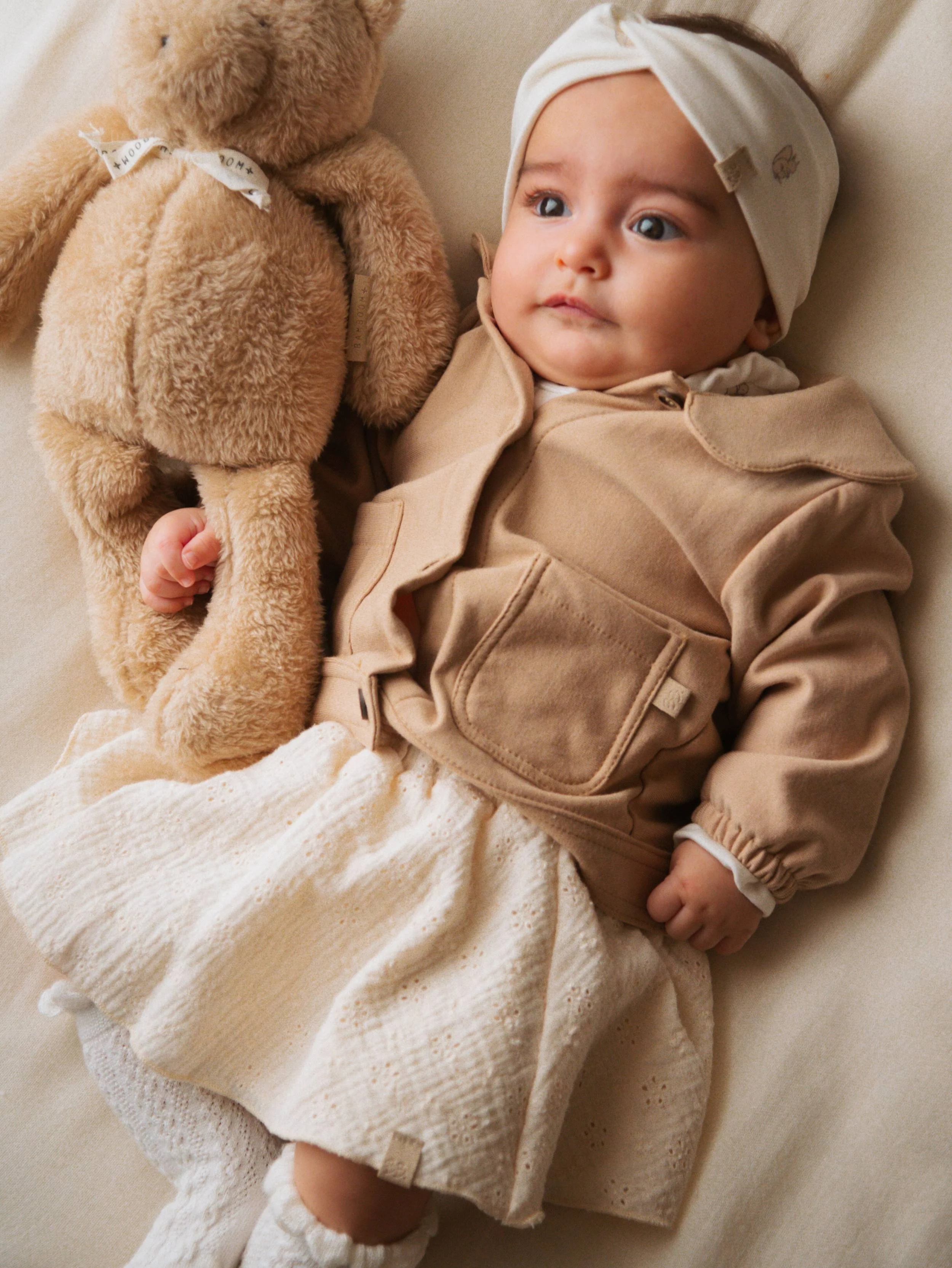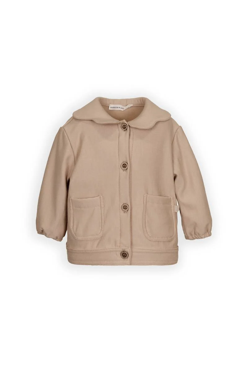 Un fiore di giacca per le bimbe più stilose! Questa giacca con colletto a fiore sagomato a petalo è un capo romantico e pratico, perfetto per le giornate più fresche. La variante Mocha Sand è realizzata in morbido moletone (viscosa di bambù e cotone), un tessuto di origine naturale, morbido e traspirante. Dotata di pratiche taschine frontali, bottoni in legno e polsini elasticizzati, questa giacca unisce estetica e funzionalità. Ideale per essere indossata sopra un vestito o con un pantalone, è un must-have per il comfort e lo stile.