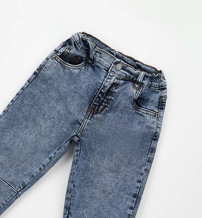Jeans bimbo slim fit in denim chiaro stretch con vita elasticizzata. Comodo, resistente e versatile, ideale per look casual e quotidiani.