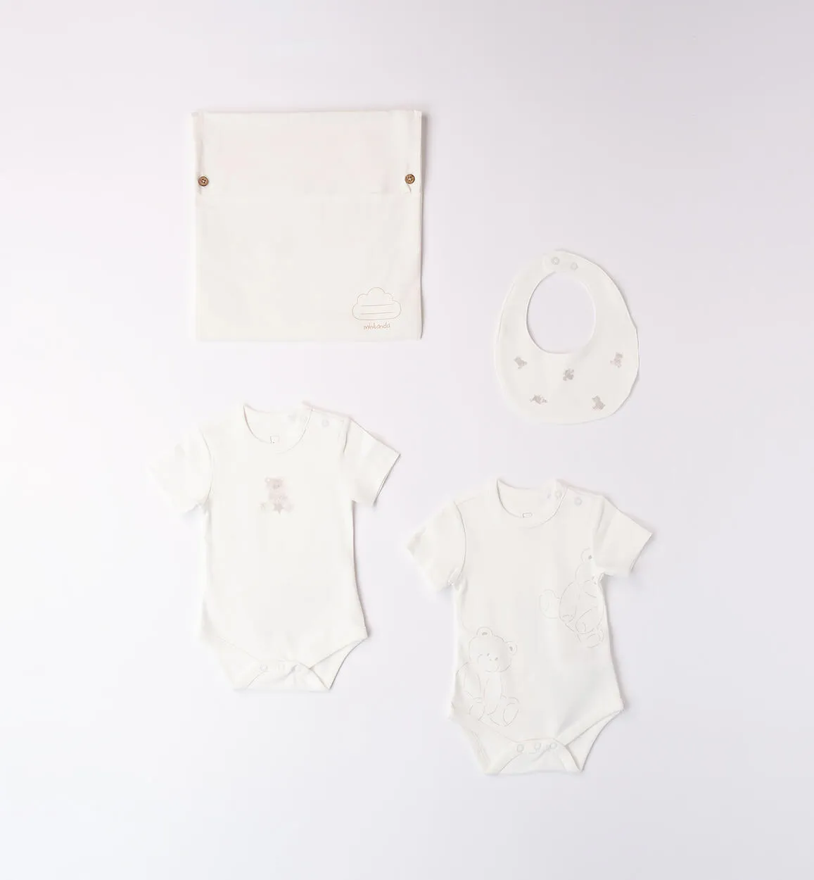 Kit regalo neonato unisex (2 body, bavetta e sacchettino) in interlock 100% cotone. Ideale per i nuovi arrivati. Supporta Better Cotton.