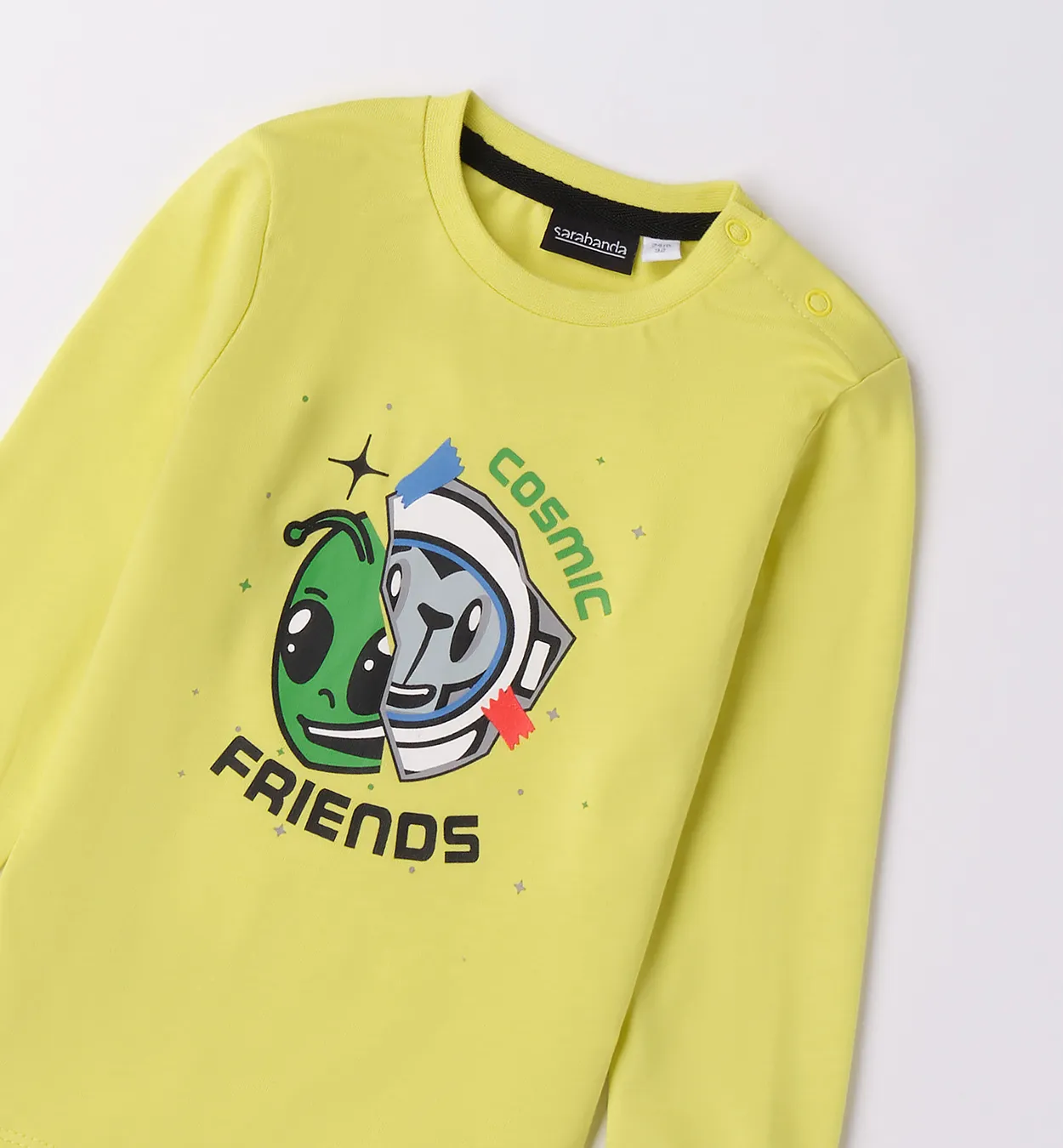 La Maglietta per bambino Sarabanda è sinonimo di massimo comfort per l'uso quotidiano. Realizzata in 100% cotone jersey manopesca, offre una morbidezza eccezionale, perfetta sulla pelle delicata. Questo capo essenziale è arricchito da una simpatica stampa che aggiunge un tocco di allegria e personalità. Il cotone di alta qualità assicura traspirabilità e resistenza ai lavaggi, rendendo questa maglietta la scelta ideale per la scuola, il gioco e ogni avventura del tuo bambino.