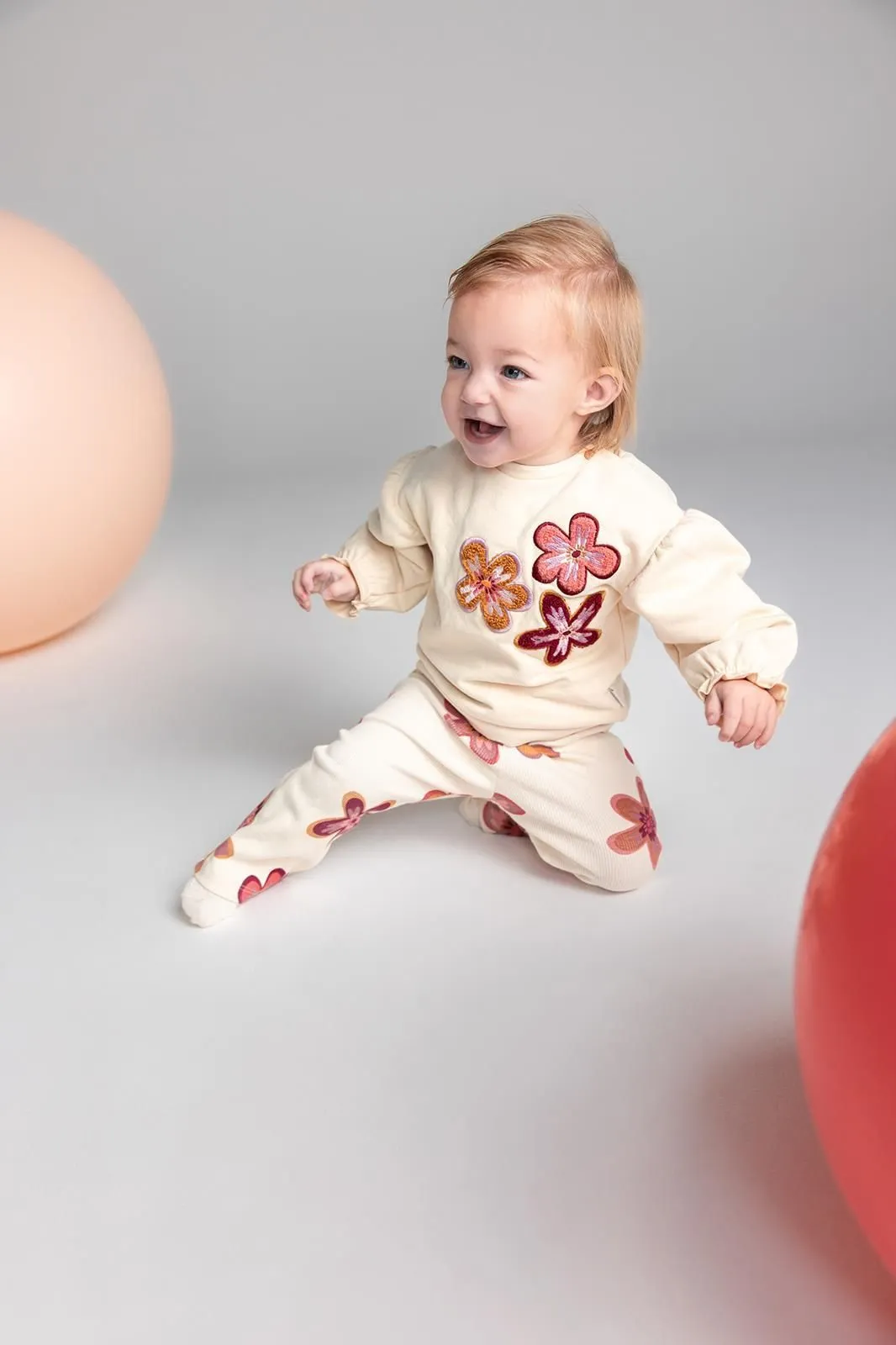 Maglione in cotone biologico GOTS con delicati fiori ricamati, scollo con chiusura a scatto e volant. Morbido e sostenibile.