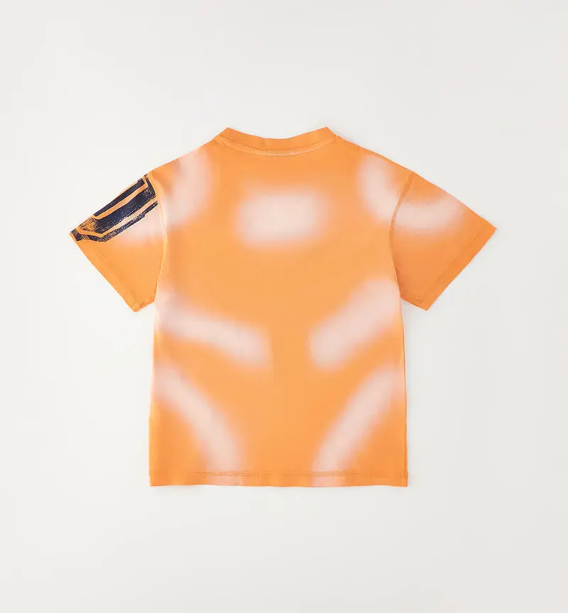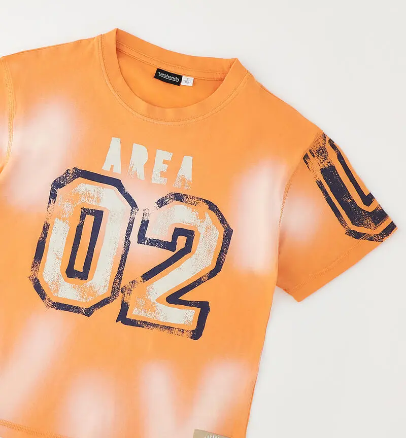Grintosa, solare e super cool: la t-shirt ragazzo è il capo perfetto per dare carattere agli outfit di stagione.Realizzata in cotone morbido e leggero, assicura comfort e libertà di movimento per tutta la giornata. Il suo arancione acceso con effetto sfumato cattura lo sguardo e trasmette energia, mentre la maxi stampa frontale in stile college richiama il mood varsity americano, sempre attuale e di tendenza.Il dettaglio grafico sulla manica aggiunge un twist urban che rende il look ancora più dinamico. La vestibilità regolare, con girocollo e maniche corte, la rende facile da abbinare a jeans, joggers o bermuda per creare outfit casual dal forte impatto visivo.Perfetta per la scuola, il tempo libero o le uscite con gli amici, è la maglietta ideale per chi ama uno stile sportivo ma con personalità.