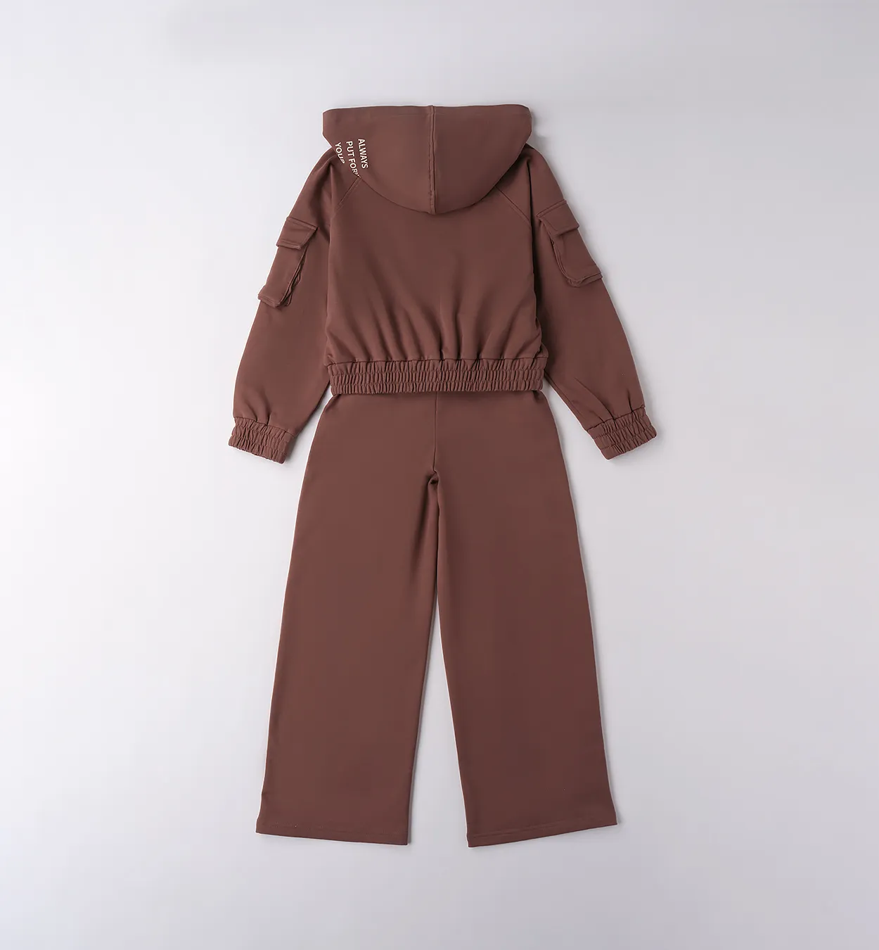 Tuta ragazza in felpa stretch di cotone garzata. Felpa con zip, tasche sulle maniche e pantalone con coulisse.