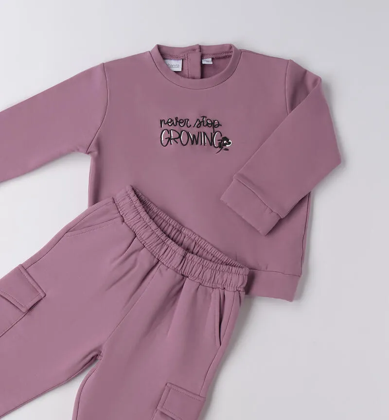 Tuta bambina Sarabanda in tessuto felpato stretch. Felpa girocollo e pantalone cargo con elastico. Comoda e alla moda.