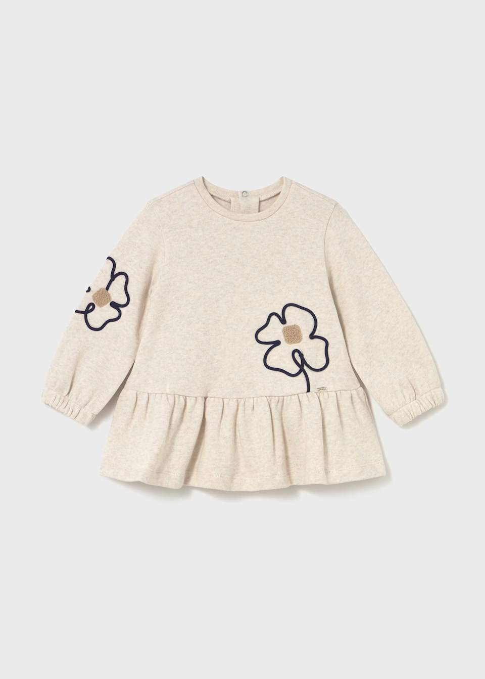 Vestito neonata in cotone con maniche lunghe, riccio, ricami e stampa floreale. Chiusura a pressione sul retro. Morbido, pratico e sostenibile.